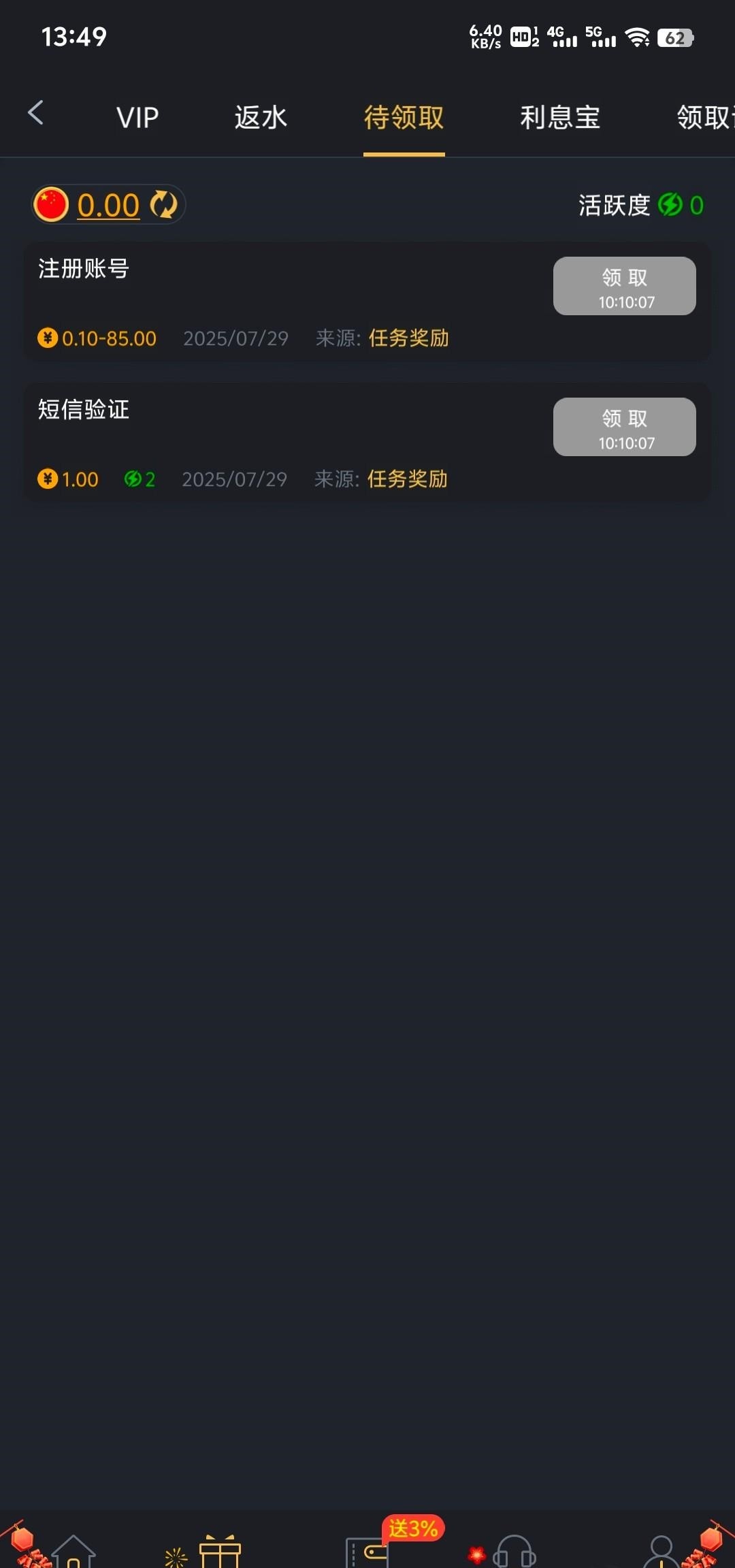 注册后在待领取的区域显示随机送0.10~85彩金不等!要等凌晨才能领取!老哥都去薅一下!看看能到多少!打出来的麻烦在评论区助力一下!请勿充值!官方链接:85.vip