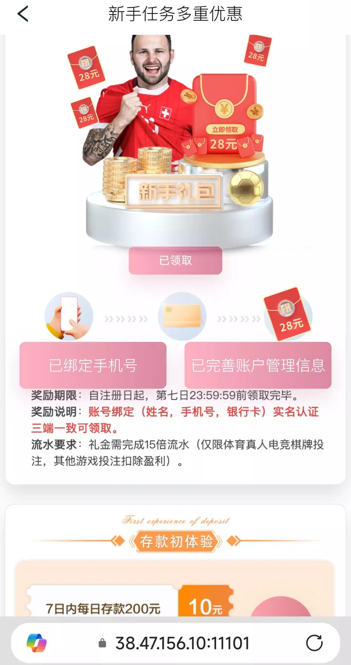 下面有投注要求,手机号,银行卡最好绑定一个人的,领取不到,联系客服刷新